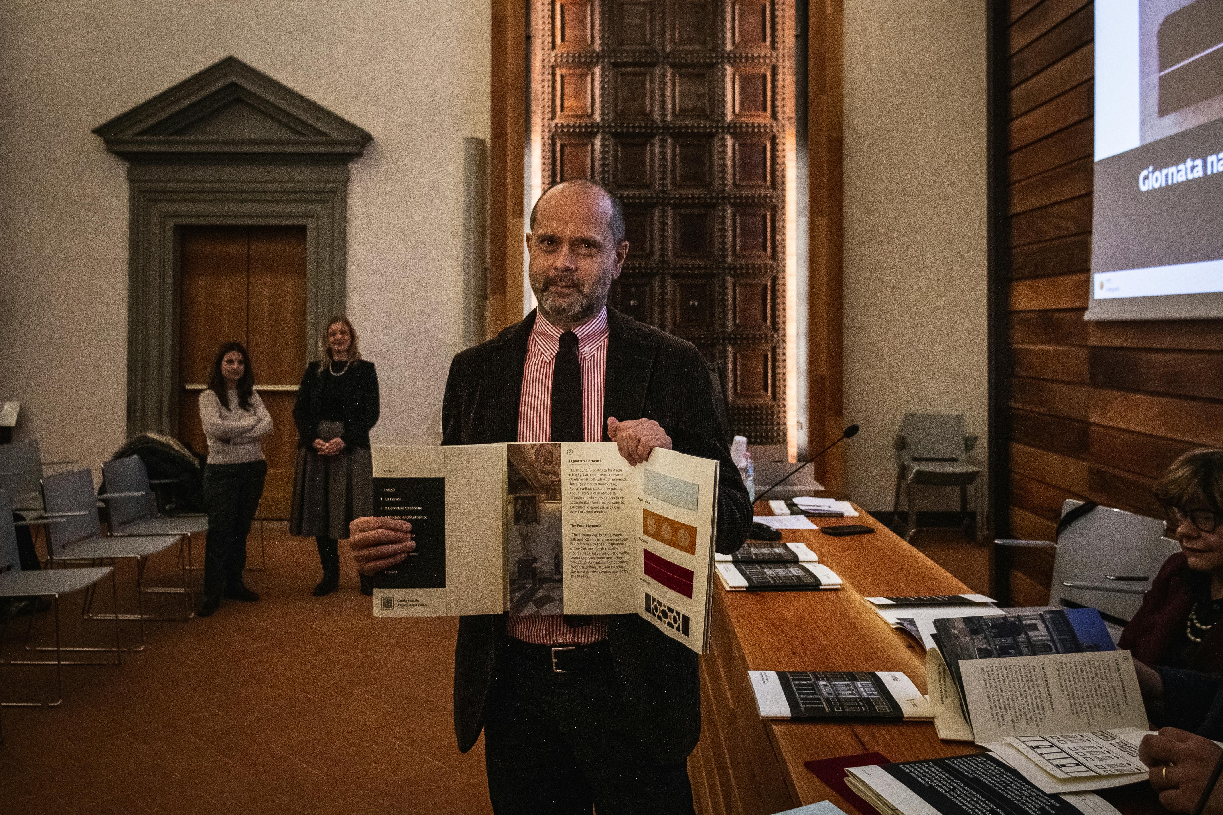 Si tratta del terzo capitolo editoriale di un progetto di ampliamento dell’accessibilità culturale delle collezioni che il museo ha intrapreso ormai da alcuni anni. I primi due volumi, pubblicati negli anni scorsi, approfondivano due capolavori della pittura, la Primavera di Botticelli e la Velata di Raffaello, attraverso tavole a rilievo e dettagli fotografici ingranditi. I libri tattili sono strumenti che nascono per agevolare l’accesso ai contenuti culturali da parte delle persone cieche e ipovedenti, ma posseggono la capacità di suscitare l'interesse di tutti i pubblici, spostando l'attenzione verso una modalità di fruizione dell’arte alternativa. Come i precedenti volumi, anche quello presentato oggi garantisce la possibilità di fruire in vari modi dei contenuti: i caratteri ingranditi facilitano la leggibilità anche alle persone ipovedenti, i QR code consentono ascoltare audiodescrizioni che approfondiscono i contenuti testuali e maggiore centralità è stata data ai testi in codice braille e alle tavole a rilievo. È da sottolineare come l’esplorazione tattile in questo terzo volume sia ulteriormente rafforzata grazie alla presenza di inserti in materiali speciali. Novità, queste, che testimoniano la sperimentazione portata avanti dalle Gallerie per ampliare sempre più l’accessibilità ai propri spazi e collezioni da parte di tutti. Grazie al nuovo libro, i lettori potranno ripercorrere la storia del palazzo degli Uffizi e la sua trasformazione da sede delle Magistrature fiorentine a museo pubblico, soffermarsi sulle mappe a rilievo e sulle tavole che ne approfondiscono le caratteristiche architettoniche. Il volume, realizzato con la collaborazione scientifica dell’Unione italiana Ciechi e Ipovedenti di Firenze e progettato in collaborazione con Atipiche Edizioni, è acquistabile nei bookshop dei musei delle Gallerie degli Uffizi e on-line.