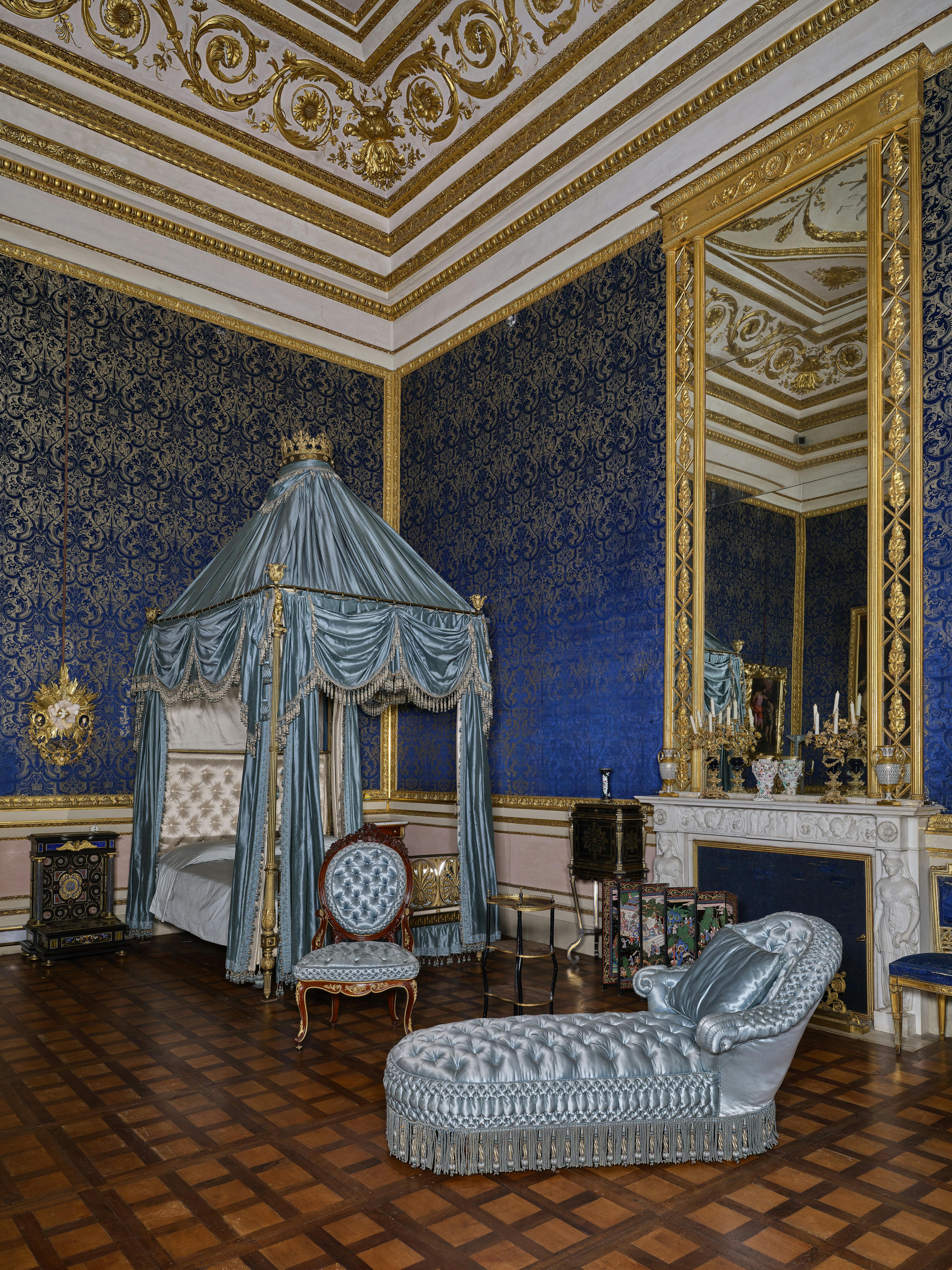 Ai tempi dei Medici, quando faceva parte dell’appartamento del Gran Principe Ferdinando (1663-1713), l’ambiente ospitava il ‘trucco’, un gioco simile al biliardo. Con gli Asburgo-Lorena (1737-1799 e 1814-1859) la sala venne utilizzato in un primo tempo come salotto della granduchessa. Successivamente fu destinata a camera da letto e con questa funzione rimase anche nel periodo sabaudo, fino al 1919, ospitandovi durante i soggiorni fiorentini la regina Margherita (1851-1926). Montato nel 1844, il broccatello di seta blu a fondo giallo evoca un clima di riposo ovattato, richiamato anche dalle due dormeuse e dai numerosi mobiletti presenti nella stanza.