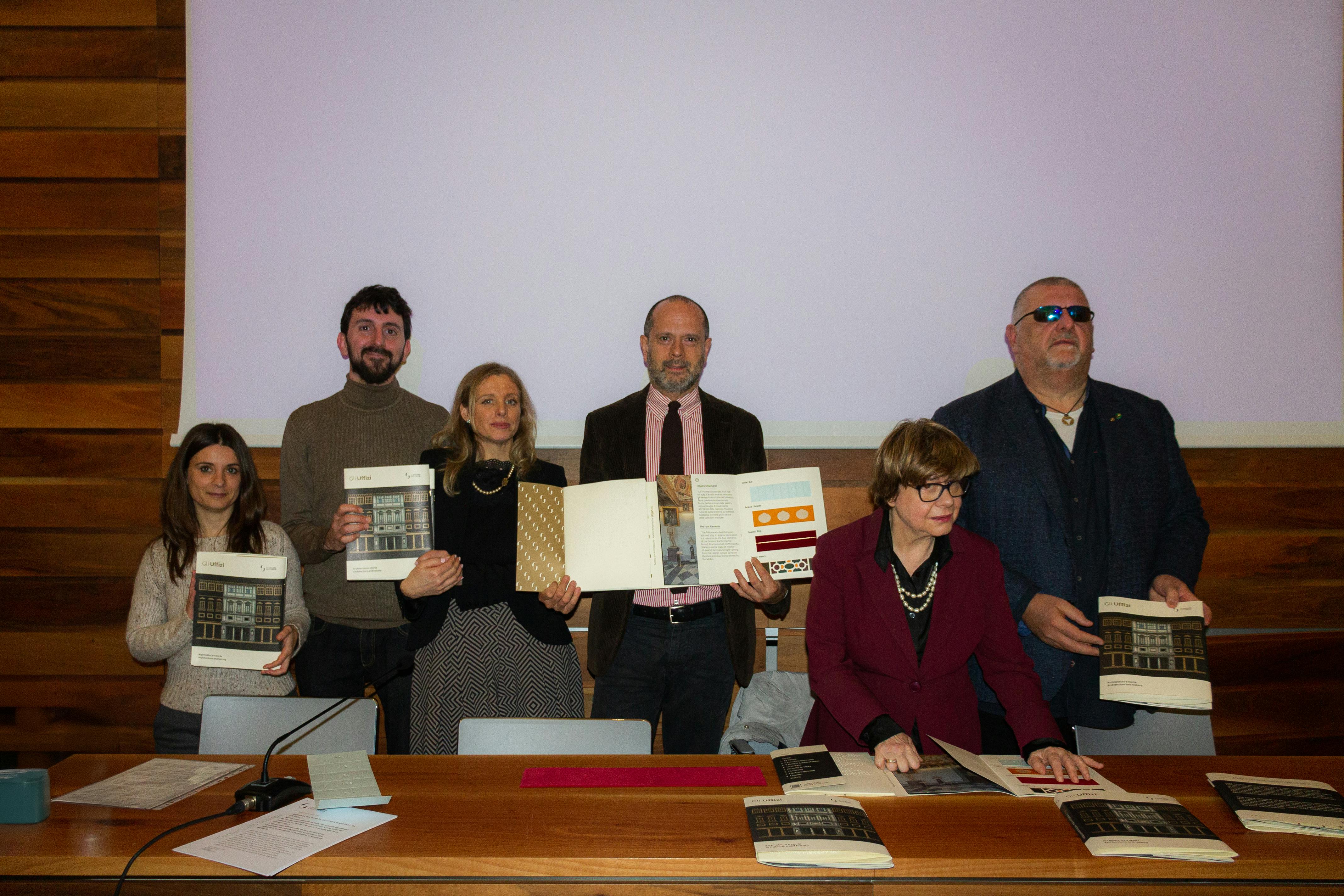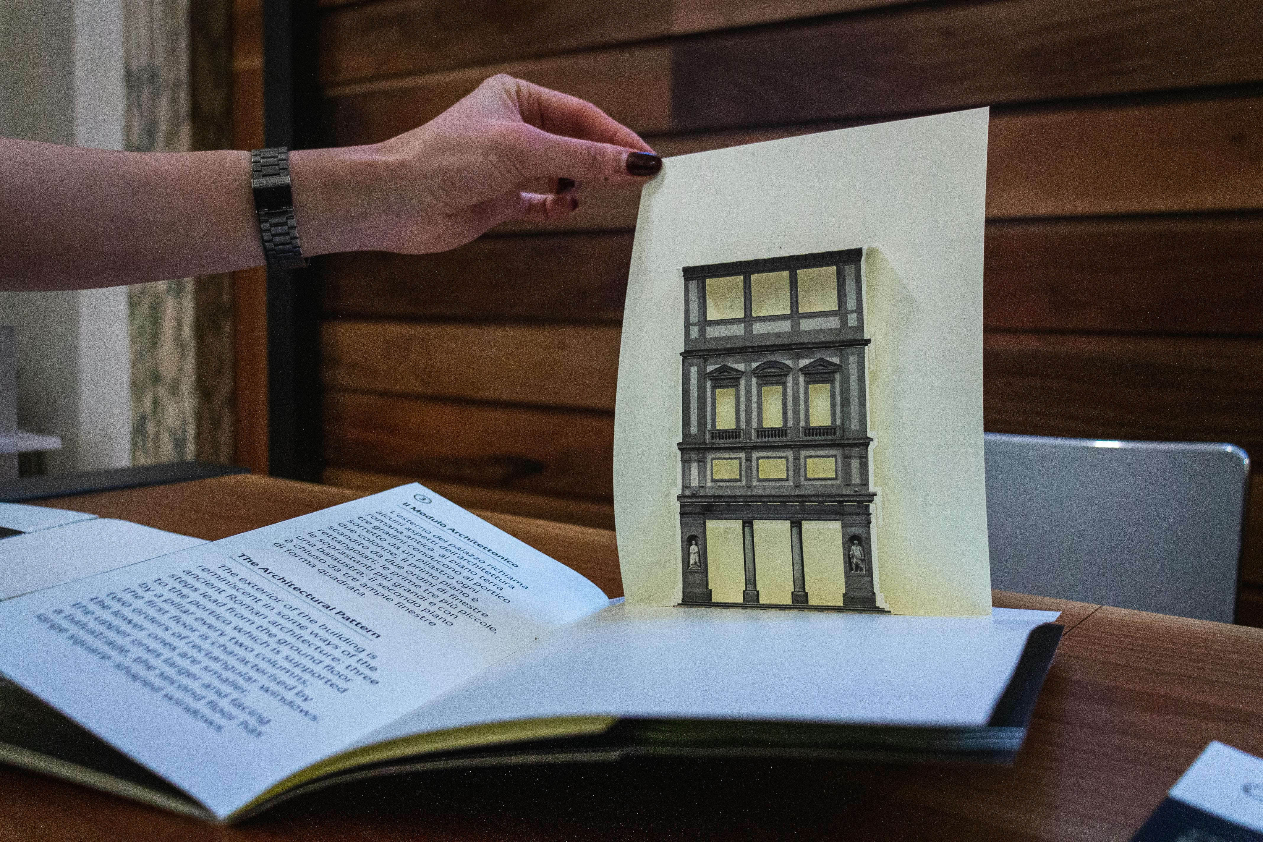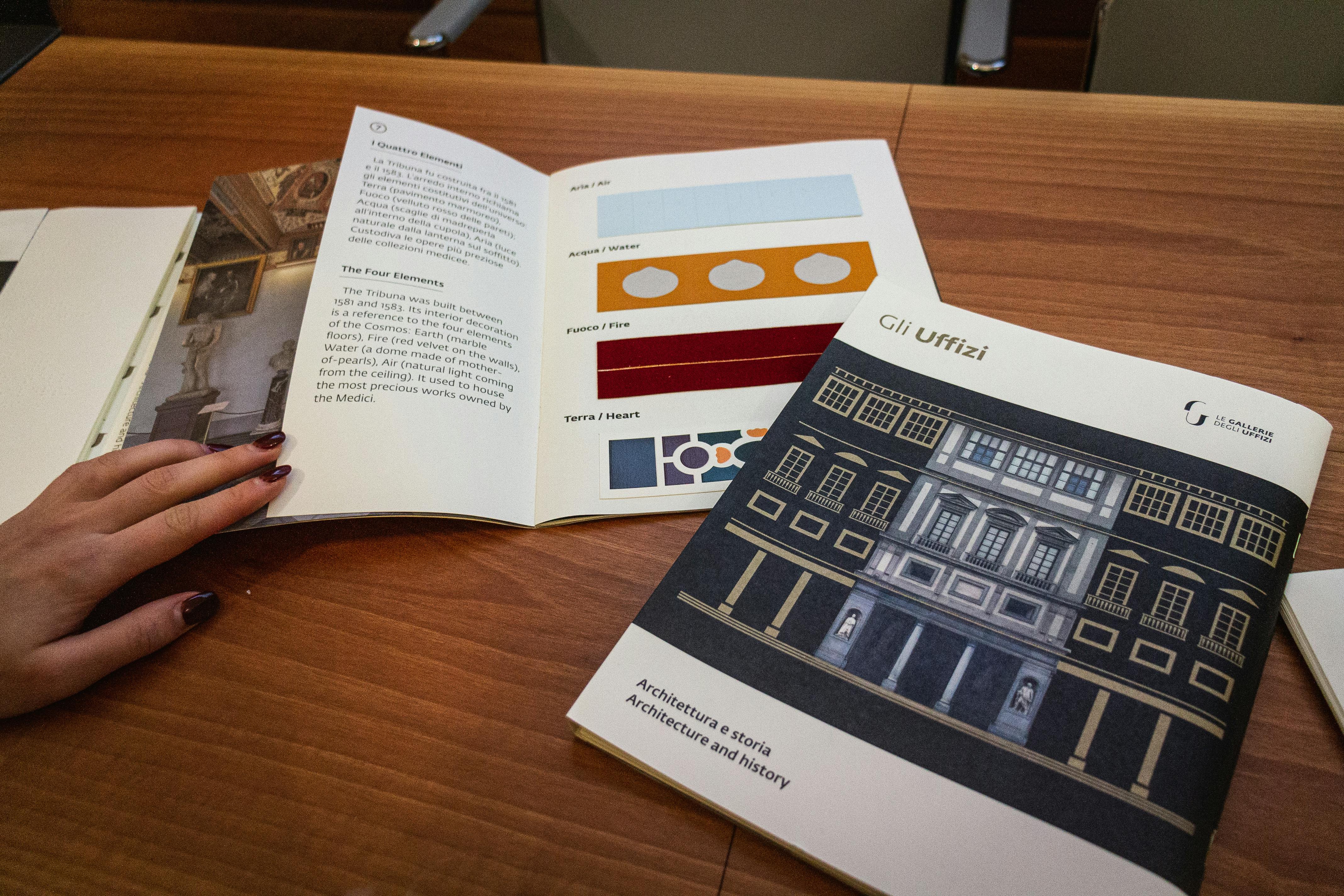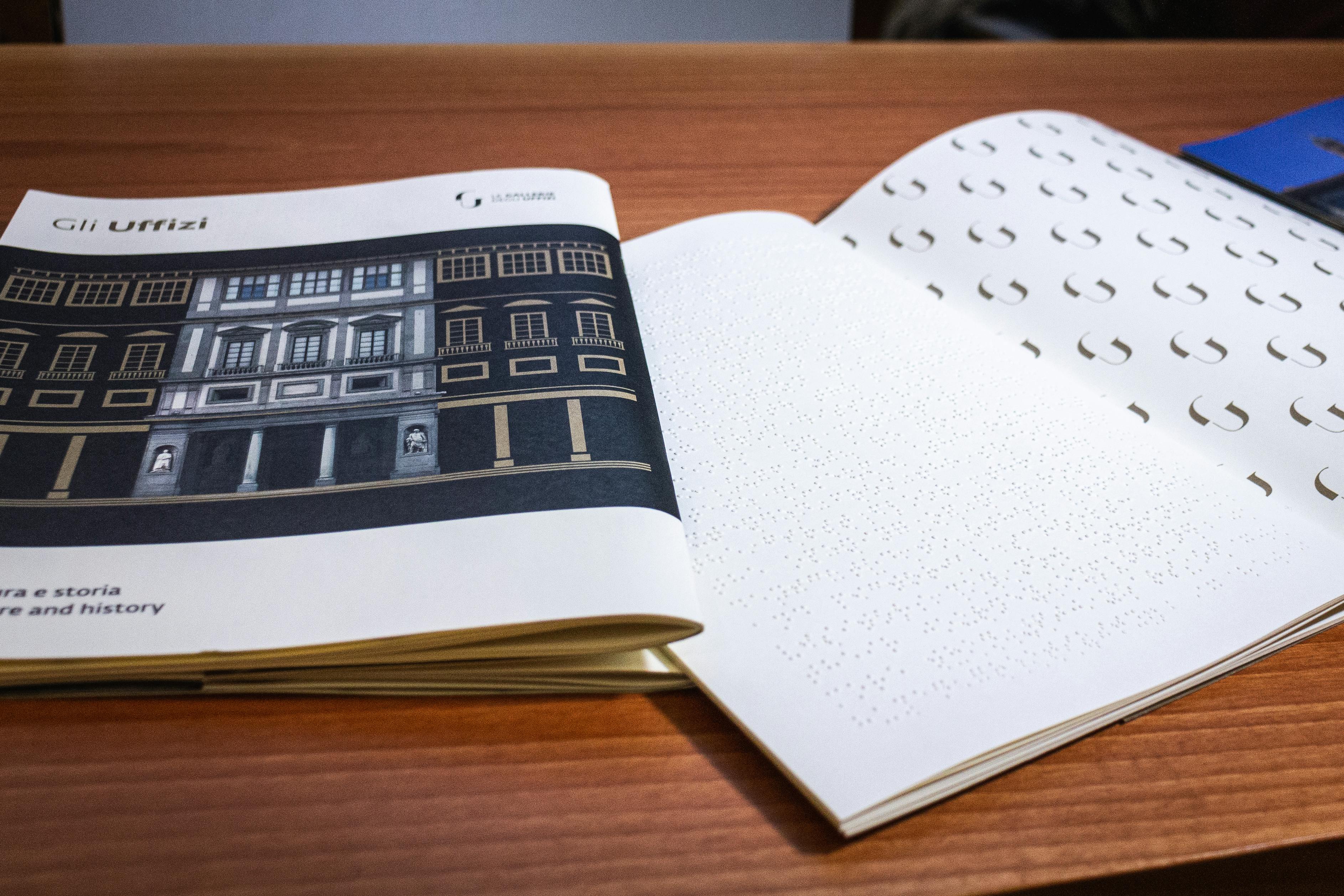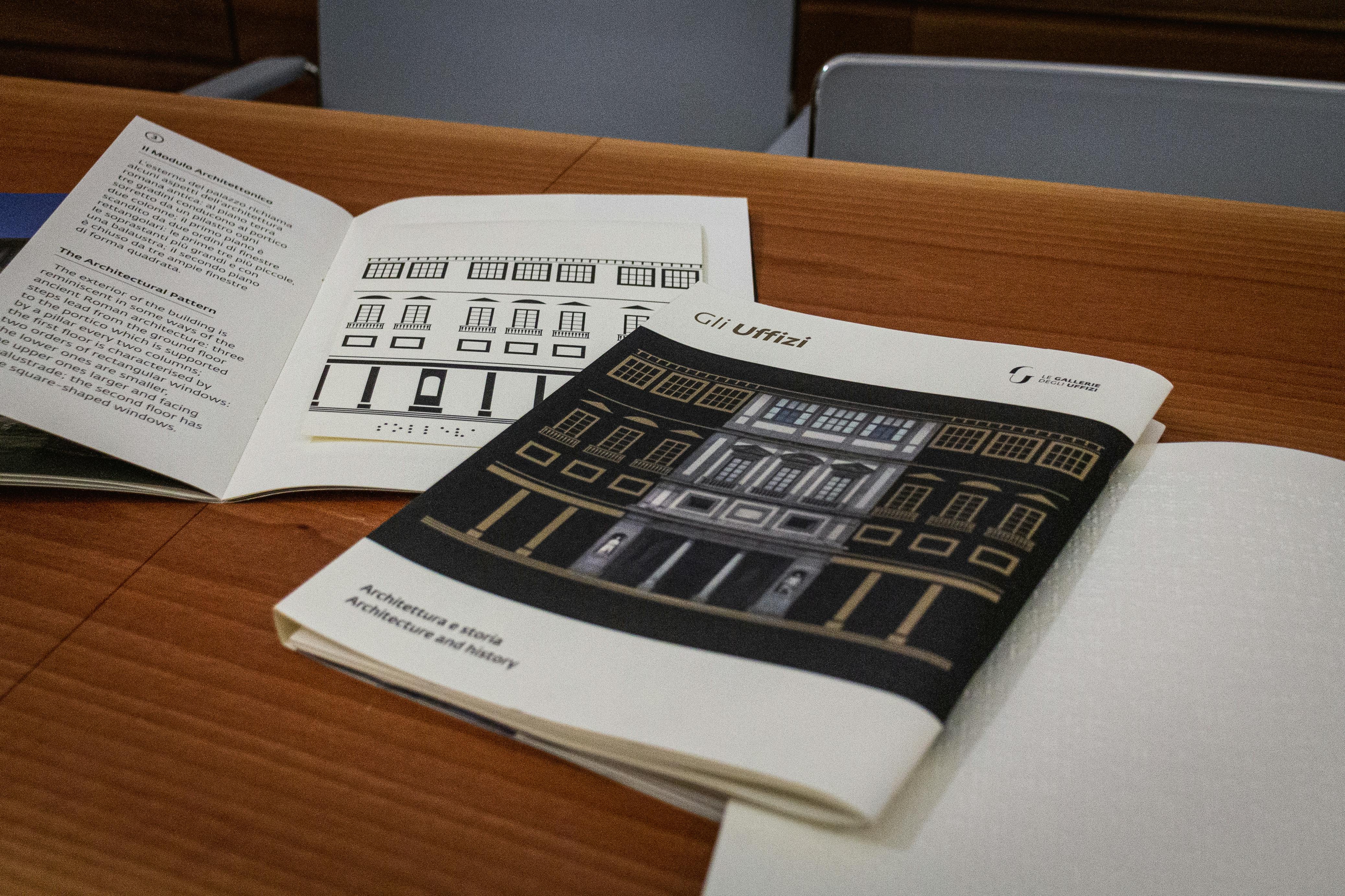 Si tratta del terzo capitolo editoriale di un progetto di ampliamento dell’accessibilità culturale delle collezioni che il museo ha intrapreso ormai da alcuni anni. I primi due volumi, pubblicati negli anni scorsi, approfondivano due capolavori della pittura, la Primavera di Botticelli e la Velata di Raffaello, attraverso tavole a rilievo e dettagli fotografici ingranditi. I libri tattili sono strumenti che nascono per agevolare l’accesso ai contenuti culturali da parte delle persone cieche e ipovedenti, ma posseggono la capacità di suscitare l'interesse di tutti i pubblici, spostando l'attenzione verso una modalità di fruizione dell’arte alternativa. Come i precedenti volumi, anche quello presentato oggi garantisce la possibilità di fruire in vari modi dei contenuti: i caratteri ingranditi facilitano la leggibilità anche alle persone ipovedenti, i QR code consentono ascoltare audiodescrizioni che approfondiscono i contenuti testuali e maggiore centralità è stata data ai testi in codice braille e alle tavole a rilievo. È da sottolineare come l’esplorazione tattile in questo terzo volume sia ulteriormente rafforzata grazie alla presenza di inserti in materiali speciali. Novità, queste, che testimoniano la sperimentazione portata avanti dalle Gallerie per ampliare sempre più l’accessibilità ai propri spazi e collezioni da parte di tutti. Grazie al nuovo libro, i lettori potranno ripercorrere la storia del palazzo degli Uffizi e la sua trasformazione da sede delle Magistrature fiorentine a museo pubblico, soffermarsi sulle mappe a rilievo e sulle tavole che ne approfondiscono le caratteristiche architettoniche. Il volume, realizzato con la collaborazione scientifica dell’Unione italiana Ciechi e Ipovedenti di Firenze e progettato in collaborazione con Atipiche Edizioni, è acquistabile nei bookshop dei musei delle Gallerie degli Uffizi e on-line.