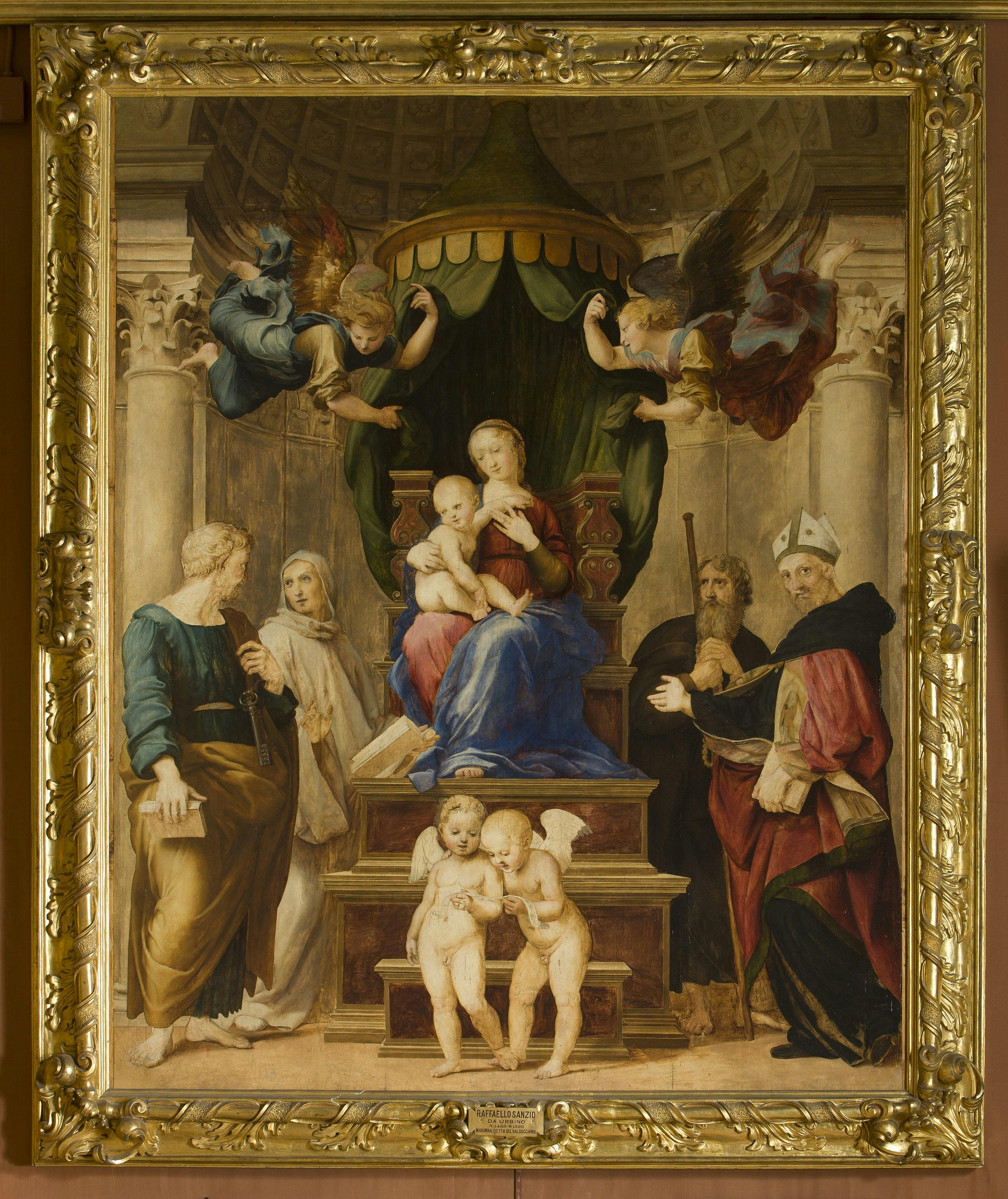 Questa pala è l’unica, ad oggi nota, fra quelle di grandi dimensioni e di destinazione pubblica appartenenti al periodo fiorentino di Raffaello. Della sua storia si sa molto grazie alla testimonianza di Giorgio Vasari che ricorda come Raffaello avesse ricevuto la commissione del dipinto dalla famiglia Dei, titolare di una cappella nella chiesa di fiorentina di Santo Spirito. Chiamato a Roma nell’autunno del 1508 da papa Giulio II che gli affidò la decorazione dei suoi appartamenti in Vaticano (oggi noti universalmente come Stanze di Raffaello), l’Urbinate lasciò incompiuta la pala per i Dei che dunque non raggiunse mai la chiesa e fu rimpiazzata nel 1522 dalla Sacra Conversazione di Rosso Fiorentino, anch’essa oggi esposta nella Galleria Palatina di Palazzo Pitti. Dopo la morte di Raffaello (o forse anche prima), la Madonna del Baldacchino fu acquistata da Baldassarre Turini, potente segretario di Leone X e datario apostolico, grande amico di Raffaello di cui fu pure esecutore testamentario, rampollo di una delle famiglie più in vista di Pescia, che la destinò alla cappella della sua famiglia nella Cattedrale della sua città natale. Qui rimase fino al 1697, anno nel quale fu comprata dal Gran Principe Ferdinando de’ Medici, figlio del granduca Cosimo III ed erede al trono granducale. La vendita scatenò violente reazioni da parte dei pesciatini, profondamente legati al culto della Vergine e al quadro di Raffaello, tanto che fu necessario spostarla di notte per poterla trasportare a Firenze, sostituendola con una copia eseguita dal fiorentino Pier Dandini. Giunta a Palazzo Pitti, la pala fu appesa nell’appartamento di Ferdinando, nell’ala meridionale del primo piano. Per adattarla al contesto della collezione principesca e alla cornice lignea intagliata e dorata che ancora possiede, la pittura fu ampliata nella parte superiore dal pittore di corte Niccolò Cassana; si spiegano così il coronamento del baldacchino a forma di cono e la calotta a lacunari che ricalca quella del Pantheon a Roma. L’invenzione di Raffaello è una delle sue più memorabili per l’armonia delle figure, la delicatezza delle espressioni e la capacità di costruzione dello spazio, arioso e monumentale ma al tempo stesso misuratissimo, elementi che provano quanto Raffaello padroneggiasse con autonomia i modelli appresi a Firenze da Fra Bartolomeo, Leonardo e Michelangelo. Il restauro compiuto presso i laboratori dell’Opificio delle Pietre Dure tra il 1987 e il 1991, e le recenti indagini compiute dallo stesso istituto in occasione della iniziativa di Uffizi Diffusi hanno stabilito che la pittura ha gradi diversi di avanzamento nell’esecuzione, ma in nessun punto è del tutto completa, confermando così l’antica testimonianza vasariana.