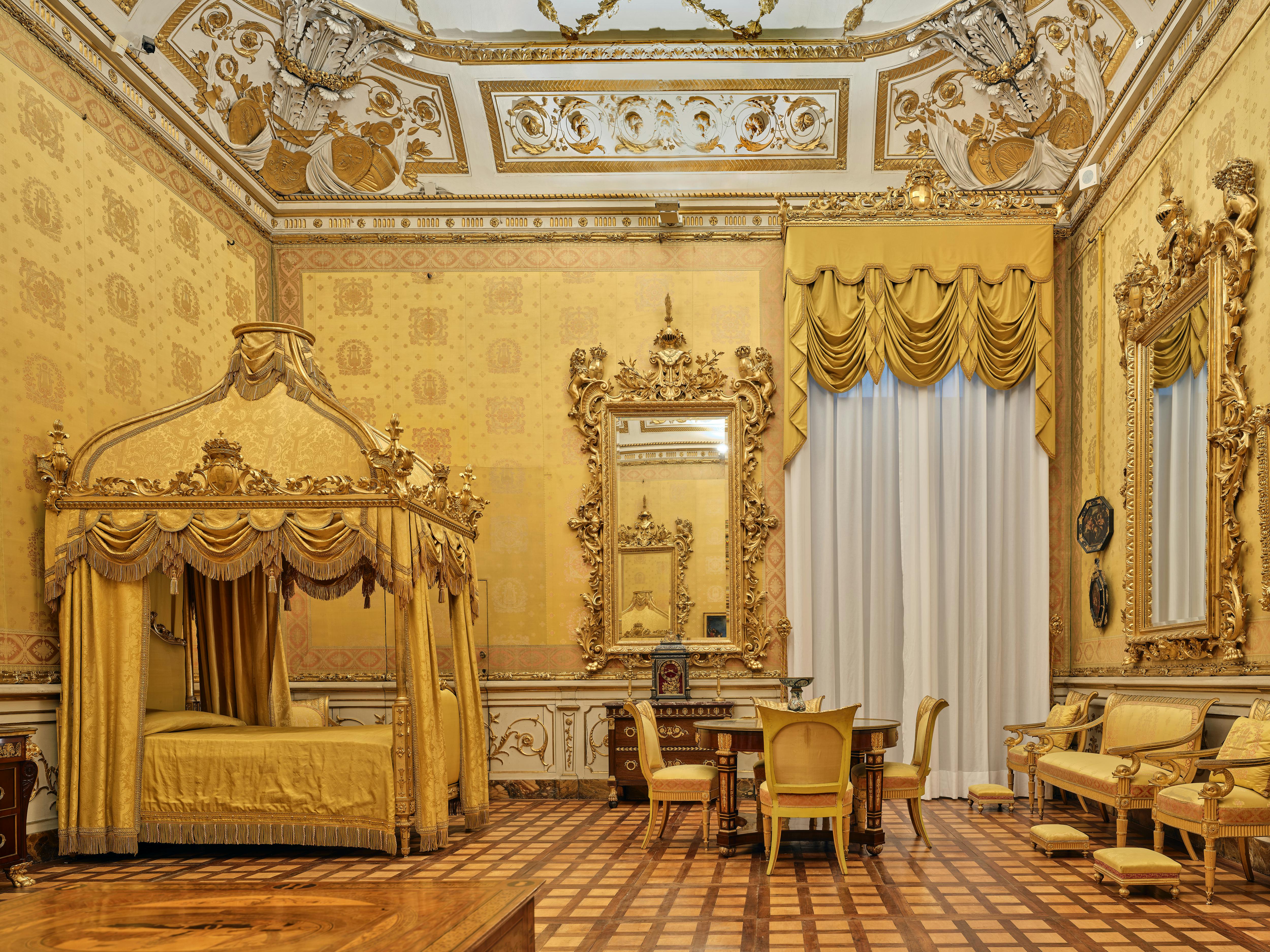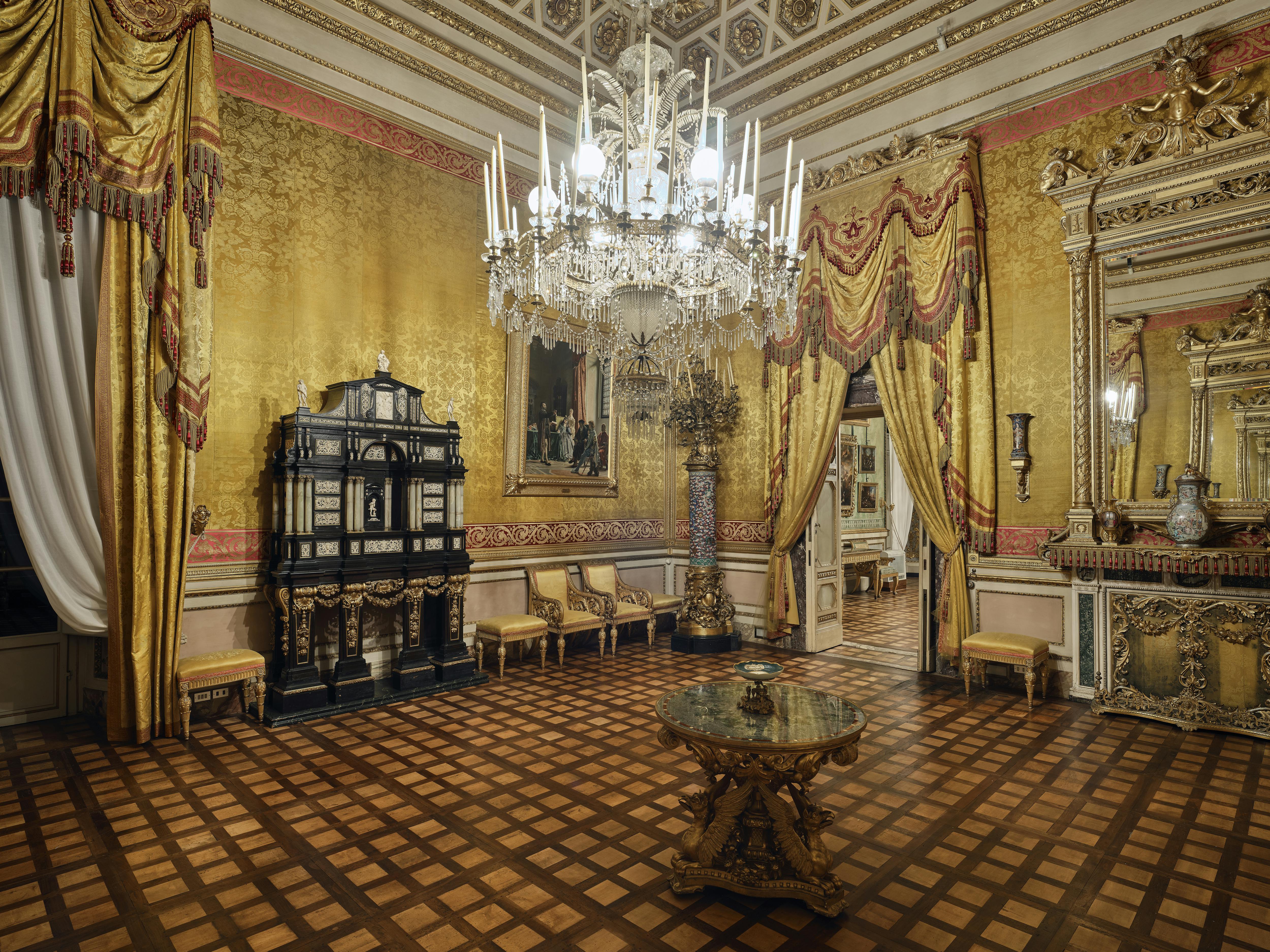 E’ questo l’ambiente degli Appartamenti Reali che meglio conserva l’aspetto mediceo originario, risalente all’epoca del Gran Principe Ferdinando, ritratto sulla destra. L’alcova ospitava un letto monumentale; al di sopra si trovava una piccola biblioteca allestita nel mezzanino celato dietro lo schermo intagliato e dorato. Gli stucchi e i cartigli della volta si riferiscono a motti e simboli legati a Ferdinando e furono eseguiti su disegno di Giovan Battista Foggini (1652-1725). Arrivato a Firenze nel 1765, il granduca Pietro Leopoldo di Asburgo Lorena (1747-1792) volle trasformare la piccola sala in cappella; mentre alla metà dell’Ottocento risalgono il lampadario nonché il parato e i tendaggi in damasco rosso cremisi che riprende motivi settecenteschi. Nel periodo sabaudo un tramezzo creava un corridoio sul lato della finestra. Arredi e dipinti rinviano a queste molteplici destinazioni d’uso.