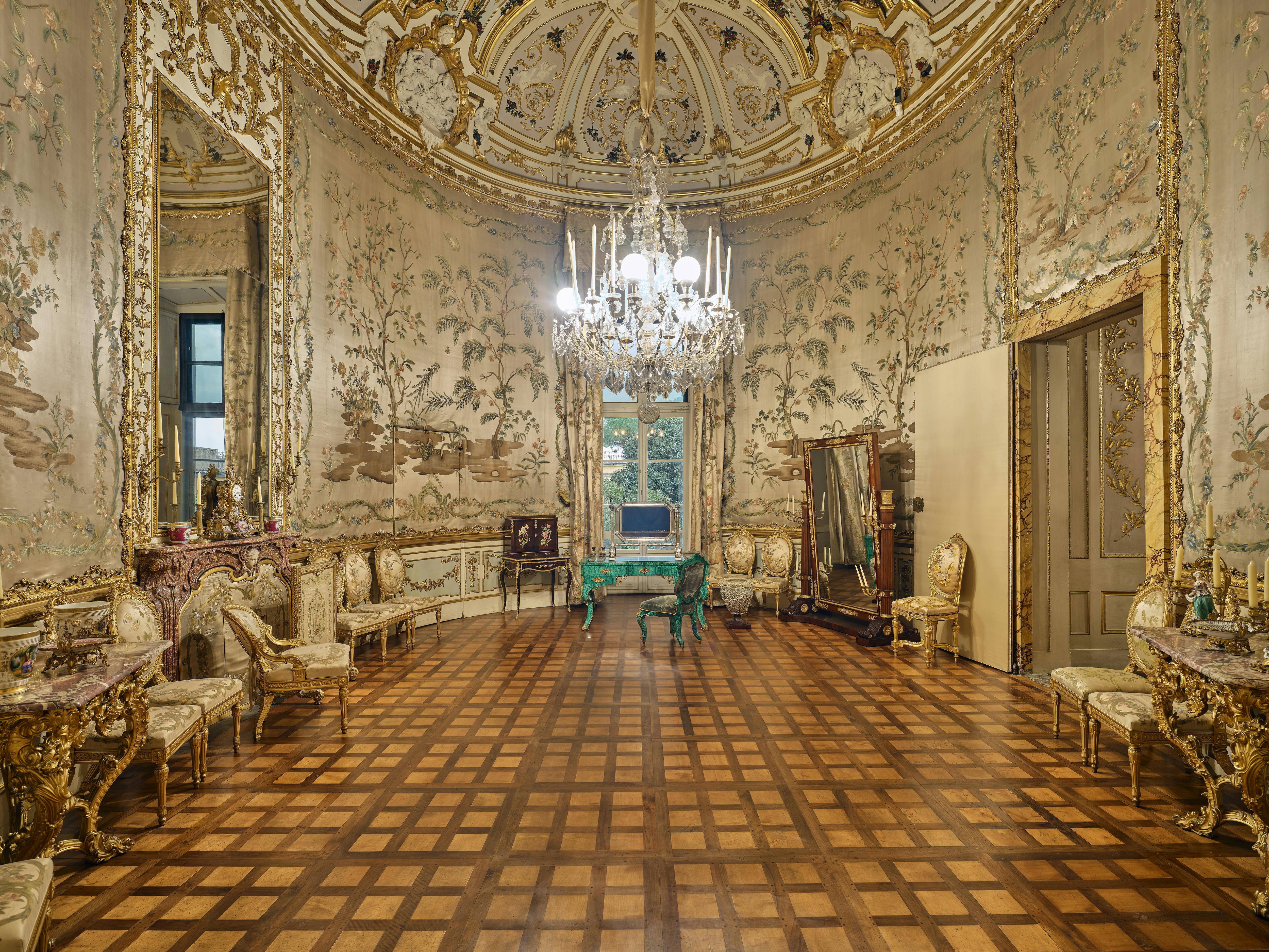Insieme all’adiacente Gabinetto Rotondo fa parte dei nuovi ambienti fatti realizzare da Maria Teresa d’Austria (1717-1780) tra il 1763 e il 1765 in previsione dell’arrivo a Firenze del proprio figlio Pietro Leopoldo (1747-1792), nuovo granduca. L’architetto Ignazio Pellegrini (1715-1790) optò per una pianta ovale, forma che ben rispondeva al gusto rococò internazionale. Gli stucchi dorati, di particolare pregio, vennero eseguiti dalla bottega milanese di Francesco Visetti, mentre il caminetto di broccatello di Spagna è sempre opera del Pellegrini. Il parato di raso di seta a fondo bianco, opera di manifattura fiorentina del 1780-1783, è l’unico del periodo di Pietro Leopoldo che ha mantenuto la sua collocazione originale. Rispecchia il gusto per le “cineserie” molto apprezzato all’epoca. La destinazione a salotto femminile, studiolo o boudoir si è tramandata attraverso i secoli fino al periodo sabaudo, quando veniva utilizzato dalla regina Margherita (1851-1926).
