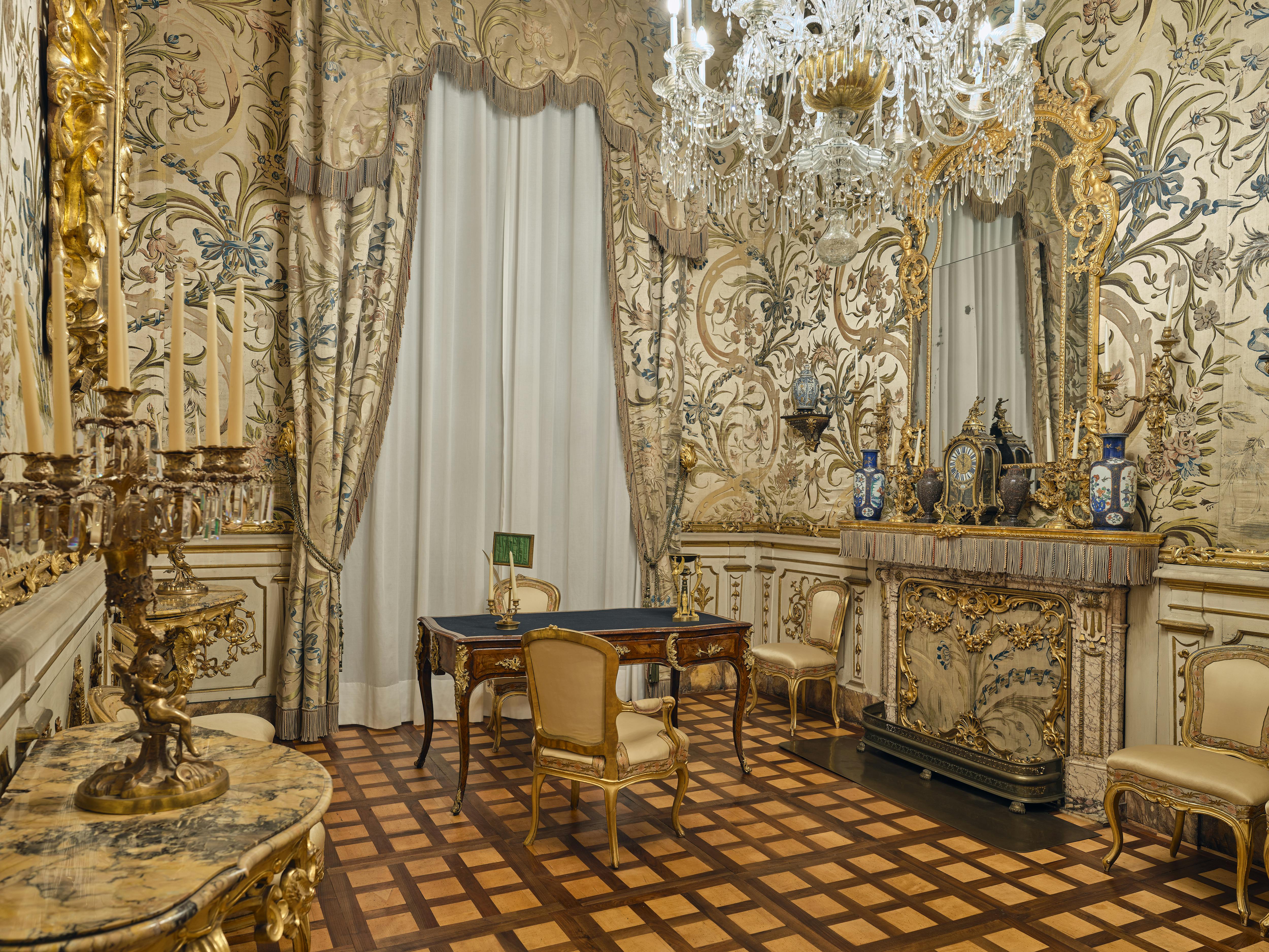 Nel 1765 per l’arrivo a Firenze da Vienna di Pietro Leopoldo d’Asburgo Lorena (1747-1792) l’ambiente divenne parte del suo appartamento privato e, come nel resto del quartiere, il soffitto fu decorato con stucchi bianchi e oro. Benché risalga allo stesso periodo la preziosa tappezzeria in seta realizzata dalle manifatture fiorentine venne montata alle pareti solo un secolo, dopo durante il regno di Umberto I di Savoia (1844-1900). All’epoca la stanza divenne studio del re utilizzando come scrittoio l’elegante esemplare francese della metà del Settecento appartenuto a Louise Elisabeth, duchessa di Parma (1727-1759), trasferito a Palazzo Pitti negli anni Ottanta dell’Ottocento con l’Unità d’Italia.
